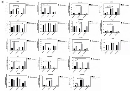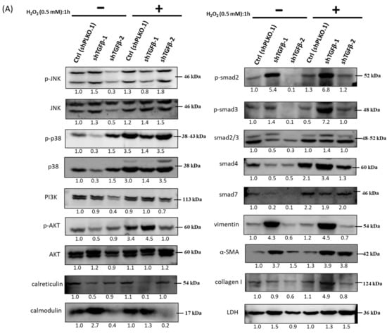 Lipofectamine® RNAiMAX transfection reagent was purchased from Invitrogen (Thermo Fisher Scientific Inc., Waltham, MA, USA) and OPTI- minimal essential medium (MEM) was purchased from Gibco (Thermo Fisher Scientific Inc., Waltham, MA, USA). MTT (3-(4,5-dimethylthiazol-2-yl)-2,5-diphenyltetrazoliumbromide) was purchased from USB Corp. (Thermo Fisher Scientific Inc., Waltham, MA, USA). Annexin-V/propidium iodide (PI) Conjugate Detection kit was purchased from Life Technologies Corp. (Carlsbad, USA). Anti-rabbit and anti-mouse immunoglobulin (Ig) G horseradish peroxidase (HRP)-conjugated secondary antibodies were purchased from Jackson ImmunoResearch Laboratories, Inc. (Baltimore, PA, USA). Anti-rabbit and anti-mouse immunoglobulin (Ig)G fluorescein isothiocyanate (FITC)-conjugated secondary antibodies were purchased from SeraCare KPL (Washington, Maryland, USA). Phospho-JNK, JNK, PI3K, phospho-AKT, AKT, vimentin, phospho-SMAD2, phospho-SMAD3, SMAD2/3, SMAD4, SMAD7, and lactate dehydrogenase (LDH) primary antibodies were purchased from Genetex Inc. (Hsinchu, Taiwan). Phospho-p38 MAPK (Thr180/Tyr182) and p38 MAPK primary antibodies were purchased from Cell Signaling Technology (Danvers, MA, USA). Calreticulin, calmodulin, TGF-β1, TGF-β2, alpha-smooth muscle actin (α-SMA), and collagen I primary antibodies were purchased from ABclonal (Woburn, MA, USA). All chemicals and reagents used in this study were of analytical grade.