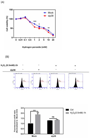 Effects on sip38 MAPK knockdown HTMCs through H2O2 exposure. (A) sip38 MAPK knockdown HTMCs decreased cell viability with H2O2 at different concentrations for 1 h when compared to the si-control (mock) group. Data reflect that ssip38 MAPK knockdown HTMCs were more susceptible and sensitive to oxidative stress. Values in the plots are normalized against the control group (Mock-Ctrl); Statistic chart were represented as means ± SEM. *, p < 0.05; **, p < 0.01; ***, p < 0.001; (n = 3, independent experiments). (B) Levels of ROS intensity in sip38 MAPK knockdown HTMCs with or without H2O2 treatment (0.5 mM) for 1 h. Data show that insip38 MAPK knockdown HTMCs had increased ROS levels; H2O2 (0.5 mM) treatment for 1 h led to no significance increase. Values in the plots are normalized against the control group (Mock-Ctrl); Statistic chart were represented as means ± SEM. ***, p < 0.001; ns, non-significant; (n = 3, independent experiments).