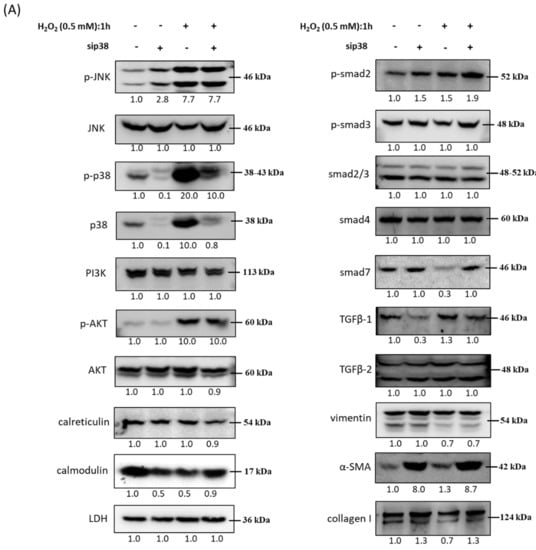 Immunoblot analysis and identification of sip38 MAPK knockdown HTMCs in oxidative stress pathways. (A) Si-control (mock) and sip38 MAPK knockdown cells were collected after treatment with H2O2 (0.5 mM) for 1 h, and cellular extracts were immunoblotted with p-JNK, JNK, p-p38, p38, PI3K, p-AKT, AKT, calreticulin, calmodulin, p-SMAD2, p-SMAD3, SMAD2/3, SMAD4, SMAD7, TGFβ-1, TGFβ-2, vimentin, α-SMA, and collagen I, as shown via protein bands. There was an oxidative stress-dependent increase in ECM proteins (α-SMA) and stress response, while TGF-β family members were observed to decrease. Numbers under each protein band reflect the densitometry value. (B) The protein expression intensities were quantified in relation to the loading control. Statistic chart were represented as means ± SEM. *, p < 0.05; **, p < 0.01; ***, p < 0.001 (n = 3).