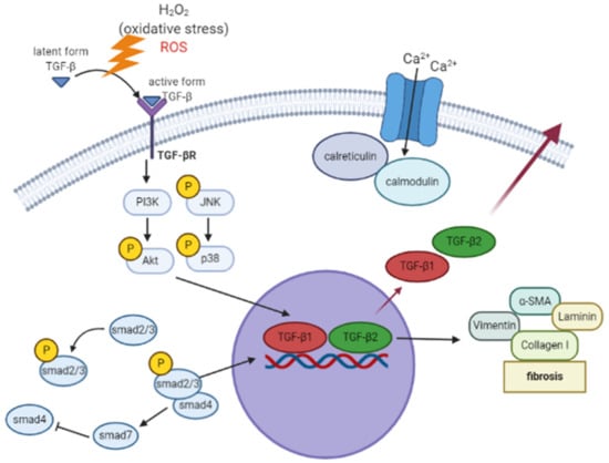 In the H2O2-mediated oxidative state, the increased ROS activates TGF-β conversion from the latent form to the active form to induce downstream signaling. Upregulated TGF-β in HTMCs subsequently induces phosphorylation of JNK, p38, and AKT, further inducing the increase in TGF-β1 and TGF-β2 level, which causes the appearance of downstream fibrosis markers (vimentin, α-SMA, collagen I, laminin). Increased fibrosis markers may damage the HTMC drainage system and enhance resistance to aqueous humor cycling, resulting in glaucoma, optic nerve death, and visual loss (Figure 11).