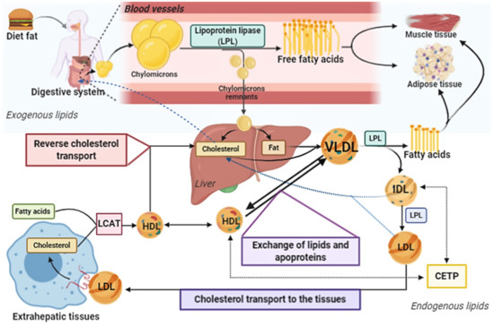First, dietary fat is emulsified by bile salts, being degraded by lipases. Fatty acids are absorbed through the intestinal mucosa, being converted into triacylglycerol. Then there is the joint incorporation of cholesterol, triglycerides and apolipoproteins (Apo-CII and Apo-B48), forming the chylomicrons. Dietary fat is transported in the blood and lymph vessels by the chylomicrons. Apo-CII on the surface of chylomicron activates the enzyme lipoprotein lipase (LPL), which releases fatty acids and glycerol to tissues, mainly muscle and adipose tissues. In tissues, fatty acids can be esterified and stored or used to generate energy in cellular function. This process results in the formation of chylomicron remnants (Apo-B48 and Apo-E in surface), that have cholesterol and low triglyceride content. They are transported to the liver, where receptors bind to the Apo-E, leading to endocytosis and subsequent degradation in lysosomes, with the release of cholesterol and fatty acids. In the liver, very-low density lipoprotein (VLDL) is formed. It is rich in triacylglycerols (about 55%) and contains on its surface the following Apos: B100, E and C I, II, III. The Apo-C and -E in VLDL come from plasma high-density lipoproteins (HDL). In addition, during the lipolysis process, Apo-C, cholesterol and phospholipids are transferred from VLDL to HDL. LPL hydrolyzes VLDL in capillaries releasing fatty acids to tissues. The hydrolysis process gives rise to the IDL (or remaining VLDL), with Apo-E and Apo-B100 on its surface. IDLs are endocytosed in the liver, after binding to the low-density lipoprotein (LDL) (Apo-B100) or LDL receptor related protein (LRP) (binding to the Apo-E). IDL is also converted to LDL (about 50% cholesterol) by the action of liver LPL, which contains only one Apo-B100 molecule on its surface. This mechanism is not yet fully described. However, it is believed that there is an exchange of apolipoproteins and lipid content between HDL and IDL, by cholesterol ester transfer protein (CETP), together with phospholipid and triacylglycerol hydrolysis by hepatic LPL for the formation of LDL. LDL transports cholesterol to the extra-hepatic tissues by the binding of Apo-B100 to the LDL receptor or scavenger receptors followed by endocytosis. LDL receptor expression is downregulated by the content of intracellular cholesterol. Cholesterol is transported from tissues to the liver by HDL, which contains apolipoproteins A, C and E. In tissues, the ATP-binding cassette (ABC)-A1 and G1 proteins participate of the transport of cholesterol to HDL. Cholesterol in plasma is esterified by lecithin-cholesterol acyl transferase (LCAT), an enzyme activated by apolipoprotein-AI (Apo-AI). LCAT, in conjunction with lecithin (present in HDL), catalyzes the formation of cholesterol esters from fatty acids. As HDL captures cholesterol from tissues or lipoprotein hydrolysis, its diameter increases, from nascent HDL to discoid HDL. When the cholesterol ester content is taken, HDL migrates to the liver, binds to the Apo-AI receptor, and is released in hepatocytes. Then, cholesterol can originate VLDL or be excreted via the biliary or fecal pathways.