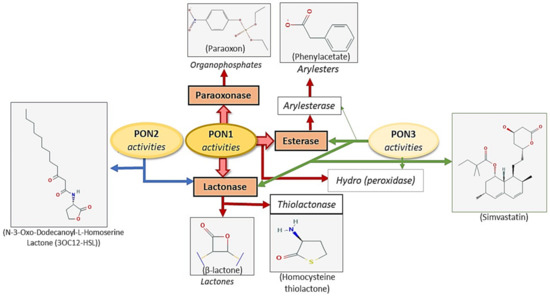 Historically, paraoxonase was named after its ability to hydrolyze paraoxon, a compound of the organophosphate insecticides class, to the metabolite p-nitrophenol [24]. In vivo, paraoxon, the most toxic form, is an oxidized product of biotransformation of parathion [24]. In fact, the PON family is able to metabolize other compounds such as: Plucuronide drugs, lactone compounds, arylesters, aromatic carboxylic acid and unsaturated aliphatic esters, cyclic carbonate, nerve gases and some carbamate insecticide classes. Figure 2. Furthermore, PON inactivates lipoxidation derivatives of low-density lipoprotein (LDL) [25,26,27].