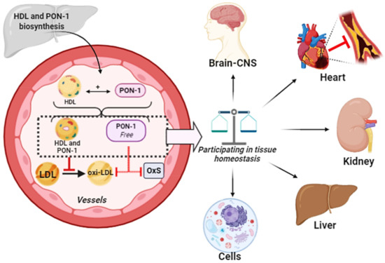 HDL biosynthesis occurs in the liver and in a small part of the intestine. Paraoxonase 1 (PON1) biosynthesis occurs only in the liver. After the formation of both HDL and PON1, they enter into the circulation. An association between HDL and PON1 can occur both in the hepatic circulation (to a lesser extent) and in the plasma. A small amount is free PON1, which do not adhere to any lipoprotein. An important function of PON1 is to prevent oxidation of both HDL and LDL, through the hydrolysis of reactive compounds. Oxidized LDL (ox-LDL) is pro-inflammatory and atherogenic. PON1 is carried to the tissues by HDL, where it performs its function as an antioxidant enzyme. In addition, the portion of free PON1 in the plasma also acts as an antioxidant, but its hydrolysis capacity is reduced.
