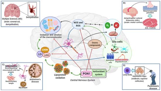 The consumption of oxygen by the brain is high. O2 is used in oxidative phosphorylation to produce energy in the form of ATP in mitochondria. ATP is used to maintain membrane potential, the flow of neurotransmitters and the synapse in neurons. During the ATP synthesis process, occurs electron (e-) leakage of the electron transport chain. The free electron reacts with oxygen and forms the superoxide radical (O2•−). Then, hydroxyl radical formation can occur from the Fenton and Haber–Weiss reactions. Reactive oxygen species (ROS) and reactive nitrogen species (NOS) react with macromolecules: Lipids, proteins, carbohydrates and DNA. Lipid peroxidation of polyunsaturated fatty acids results in the accumulation of lipid hydroperoxides (LOOH). In the degradation of LOOH, the formation of alkoxyl (LO•) and peroxyl (LOO•) radicals occurs, highly reactive with proteins and lipid members. This process is widespread and can occur anywhere in the brain. Initially, it changes neuronal and glial cell function, and then cell death. In addition, in the lipid peroxidation process cytotoxic aldehydes are formed. Cellular metabolism generates O2•−, H2O2 and NO•, that can react and oxidize neurotransmitters. Under physiological conditions, the CNS antioxidant systems (superoxide dismutase (SOD), catalase (CAT), glutathione (GSH) and PON1) are able to maintain tissue homeostasis. However, when dyshomeostasis occurs, either by an increase in toxic substances (such as organophosphate compounds) and/or oxidative stress, dysregulating lipid homeostasis, then the neurodegeneration process begins. Increased oxidative stress and decreased activity of antioxidant enzymes, such as PON1, are strongly associated with the pathophysiology of multiple sclerosis (A), amyotrophic lateral sclerosis (B), Alzheimer’s disease (C) and Parkinson’s disease (D).