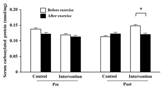 The serum carbonylated protein levels before training did not change between before and after exercise in either group (Figure 2). By contrast, it tended to be lower after than before exercise (p = 0.059) in the post-training period in the intervention group, but not significantly changed in the control group.