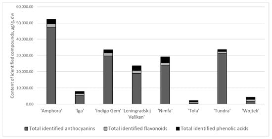 The total amounts of identified anthocyanins varied significantly within the cultivars (Table 5). The greatest average amounts were determined in ‘Amphora’ (~48 mg/g), ‘Indigo Gem‘, ‘Nimfa’, ‘Tundra’, ‘Leningradskij Velikan’ ranging 19 to 31 mg/g, and the lowest amounts were determined for ‘Tola’, ‘Wojtek’ and ‘Iga’—0.46, 1.63 and 5.39 mg/g, respectively (p < 0.05).