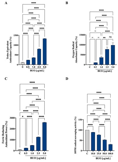 In vitro antioxidant power evaluation of the phenolic extract (BUO) extract by 2,2-azino-bis-(3-ethylbenzothiazoline-6-sulfonic acid (ABTS) (A), Oxygen Radical Absorbance Capacity (ORAC) (B), ferric reducing antioxidant power (FRAP) (C), and 2,2-diphenyl-1-picrylhydrazyl (DPPH) (D) assays. The data points represent the averages ± SD of four independent experiments performed in duplicate. All data sets were analyzed by One-way ANOVA followed by Tukey’s post-hoc test. ns: not significant and C: control sample (H2O). (*) p < 0.5; (**) p < 0.01; (****) p < 0.0001.
