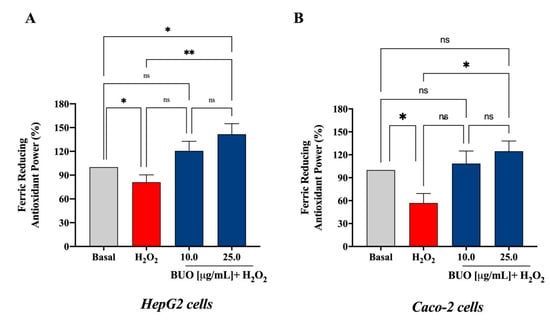 Antioxidant capacity of the BUO extract assayed at the cellular level, by ferric reducing antioxidant power (FRAP) assay. On (A) HepG2 and (B) Caco-2 cells, the BUO extract reverted the oxidative stress induced by 1 mM H2O2. Data represent the mean ± SD. of three independent experiments performed in duplicate. All data sets were analyzed by One-way ANOVA followed by Tukey’s post-hoc test. ns: not significant; (*) p < 0.5; (**) p < 0.01. Basal: untreated cells.