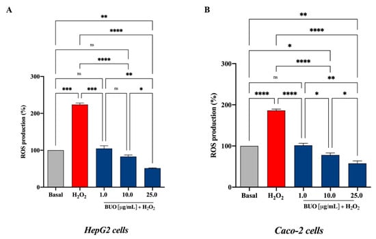 Evaluation of the effects of the BUO extracts on H2O2-induced reactive oxygen species (ROS) production levels in human hepatic HepG2 (A) and intestinal Caco-2 (B) cells. The data points represent the averages ± SD of six independent experiments in duplicate. Basal vs. H2O2 samples were analyzed by t-student test, whereas All data sets were analyzed by One-way ANOVA followed by Tukey’s post-hoc test. ns: not significant; (*) p < 0.5; (**) p < 0.01; (***) p < 0.001; (****) p < 0.0001. Basal: untreated cells.