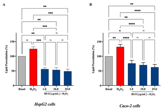 Evaluation of the effects of the BUO extract on H2O2-induced lipid peroxidation levels in human hepatic HepG2 cells (A) and intestinal Caco-2 cells (B) as assessed by intracellular MDA levels. The data points represent the averages ± SD of six independent experiments in duplicate. All data sets were analyzed by One-way ANOVA followed by Tukey’s post-hoc test. ns: not significant; (*) p < 0.5, (**) p < 0.01, (***) p < 0.001, (****) p < 0.0001. Basal: untreated cells.