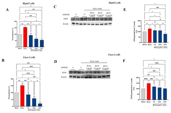Effect of the BUO extract on the H2O2 (1 mM)-induced NO levels (A,B) and inducible nitric oxide synthase (iNOS) protein levels (C–F) in human hepatic HepG2 cells (A,C,E) and intestinal Caco-2 cells (B,D,F). The data points represent the averages ± SD of six independent experiments in duplicate. All data sets were analyzed by One-way ANOVA followed by Tukey’s post-hoc test. ns: not significant; (*) p < 0.5, (**) p < 0.01, (***) p < 0.001, (****) p < 0.0001. Basal: untreated cells.
