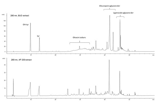 The chromatographic profiles of the AP solution of the untreated samples did not show any peak in the retention time range corresponding to the elution of the EVOO phenols (Supplementary Figure S4). Overall, the treated AP samples showed a profile very similar to that of the BUO extract (Figure 6), which has a phenolic composition summarized in Table S1. The small variation in peak shape of the most polar phenols (OH-Tyr and Tyr) was determined by the higher injected volume for the AP samples (10 µL), compared to the BUO extract (2 µL).