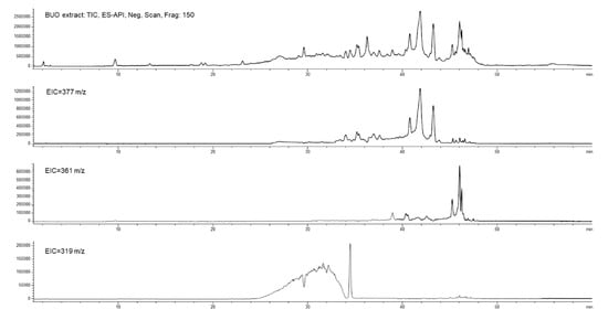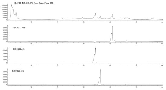Chromatographic profiles of the BL sample after incubation for 2 h of 200 µg/mL BUO extract in the AP side of Caco-2 cells with, from top to bottom: TIC, EIC at 377 m/z, EIC at 319 m/z, and EIC at 393 m/z.
