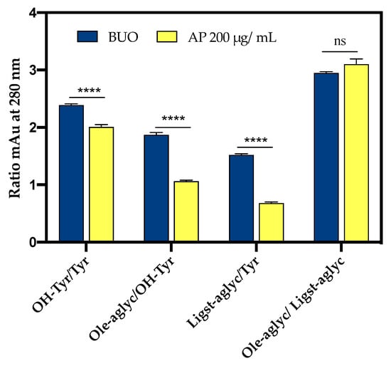 Specific ratios involving OH-Tyr, Tyr, Ole-aglyc, (rt 41.6 min) and ligstroside aglycone (Ligst-aglyc, rt 45.8 min), evaluated as area values at 280 nm for BUO extract and AP sample (AP 200 µg/mL) after 2 h incubation with 200 µg/mL BUO. (****, p < 0.0001). ns: not significant. Bars were analyzed by Two-Way ANOVA followed by Tukey’s test.