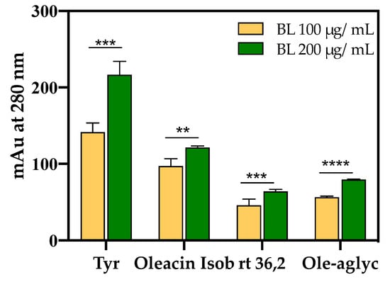 Main phenols in the BL samples were evaluated after incubation with the BUO extract at 100 and 200 µg/mL for 2 h, respectively. The data are the mean of triplicate experiments; the Ole aglycone isobar had rt 41.6 min, its oxidated derivative rt 36.2 and oleacin isobar rt 34.4 min (**, p < 0.01; ***, p < 0.001; ****, p < 0.0001). Bars were analyzed by Two-Way ANOVA followed by Tukey’s test.