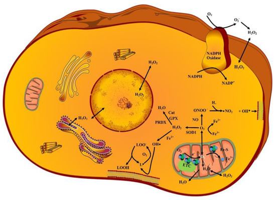 ROS contain a minimum of one oxygen [9]. Previous studies have reported various types of ROS, sources, and primary targets given as follows.