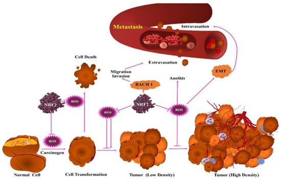 AO role in tumor promotion is based on evidence of abnormal activation of Nuclear factor erythroid 2-related factor 2 (NRF2). The NRF2 is an AO transcription factor that is involved in various forms of cancer. In basal condition, the level of NRF2 is restricted, which is attributed to their connection with KEAP1 that targets NRF2 in proteasomal degradation [170]. Cell exposure to OS causes modification of cysteine residues of KEAP1 that manifests in impaired NRF2 ubiquitination and deposition of NRF2. NRF2 fosters transcription of several genes in the AO system, including genes of GSH and TXN AO pathway [171]. NRF2 plays a complex role in various phases of cancer (Figure 3).