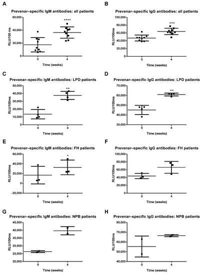 In order to confirm that Prevenar 13 vaccination induced an immune response in patients, Prevenar 13-specific plasma IgM and IgG antibody levels were measured. Four weeks after vaccination, patients displayed increased anti-Prevenar 13 IgM and IgG antibody titers, proving that the vaccine induced an appropriate immune response (Figure 2A,B). To explore potential disease-specific differences within our study population, we further analyzed Prevenar-specific antibody levels among LPD, FH and NPB patients. In LPD patients, Prevenar 13 vaccination induced an increase in anti-Prevenar IgM and IgG antibodies (Figure 2C,D). Likewise, Prevenar 13 vaccination increased Prevenar-specific antibody levels in FH patients. Furthermore, we observed an increase in Prevenar-specific IgG antibody levels in FH patients, although this did not reach statistical significance (Figure 2E,F). While we could not perform statistical analysis on the data from NPB patients (n = 2), both anti-Prevenar IgM and IgG antibodies levels tended to increase following vaccination (Figure 2G,H). A complete overview of the descriptive statistical analyses is depicted in Table S1. Overall, these findings indicate that Prevenar 13 vaccination successfully elicited an immune response.