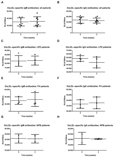 Oxidized low-density lipoprotein (OxLDL)-specific antibody titers (A–H). All error bars represent SD.