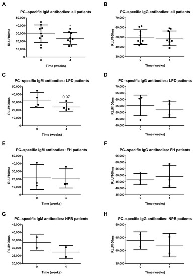 To determine whether Prevenar 13 vaccination induces an immune response against oxLDL, IgM and IgG antibody titers against oxLDL (copper oxidized moiety) were measured. No differences were observed in anti-oxLDL IgM and IgG antibody levels in either the overall patient population or the patient subgroups four weeks after Prevenar 13 vaccination (Figure 3A–H; Table S1), suggesting that the Prevenar 13 vaccine does not elicit an immune response against oxLDL in these groups. Finally, due to molecular mimicry between PC-moiety of S. pneumoniae and oxLDL, we analyzed the effect of Prevenar 13 vaccination on PC-specific IgM and IgG levels. Surprisingly, four weeks after receiving a single dose of Prevenar 13, we observed a reduction in anti-PC IgM antibody levels in all patients (Figure 4A). In contrast, no differences were observed in PC-specific IgG antibody levels in patients following Prevenar vaccination (Figure 4B). In LPD patients, Prevenar 13 vaccination tended to reduce anti-PC IgM antibody titers, although this effect did not reach statistical significance; no differences were observed in LPD patients following Prevenar 13 vaccination regarding anti-PC IgG antibody levels (Figure 4C,D). Regarding FH and NPB patients, Prevenar 13 did not elicit measurable changes in anti-PC IgM and IgG antibody levels (Figure 4E–H). More details on the statistical analysis are presented in Table S1.