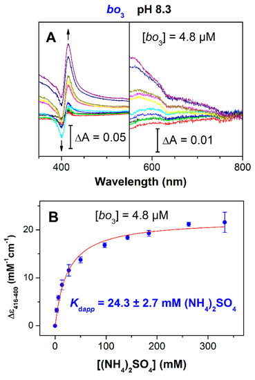 The finding that (NH4)2SO4 can inhibit cytochrome bo3 pushed us to explore the effect of ammonia on absorption spectra of the isolated cytochrome bo3. Figure 2A shows the spectral changes induced by the addition of (NH4)2SO4 at millimolar concentrations to the oxidized cytochrome bo3 at pH 8.3. The ammonia-induced spectrum showed a red shift of the enzyme Soret band with a maximum at 416 nm and a minimum at 400 nm. In the visible spectrum, some weak intensity broad bands were displayed, the most pronounced of which was a band with a minimum around 630 nm. The spectral changes caused by the ligand are possibly due to its binding to the heme o3-CuB binuclear site. The observed changes could be also due to a small reduction of the enzyme. However, the reduced-minus-oxidized spectrum in the Soret region of cytochrome bo3 showed a maximum at 428–430 nm [39,42] rather than 416 nm. The magnitude of the Soret spectral changes increased as (NH4)2SO4 concentration was increased (Figure 2B). Analysis of the titration curve yields Kdapp of 24.3 ± 2.7 mM (NH4)2SO4 and the value for maximum absorption change at 416–400 nm Amax of 22.1 ± 0.6 mM−1cm−1. It has to be noted that the titration profile (Figure 2B) is similar to that for the plot of percent inhibition versus (NH4)2SO4 (Figure 1C). The addition of (NH4)2SO4 to the dithionite-reduced cytochrome bo3 under identical conditions brought about no spectral change.