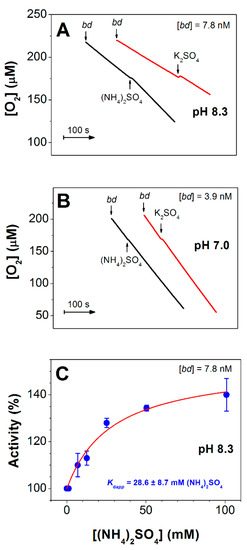 As shown in Figure 3A, at pH 8.3 the addition of 25 mM (NH4)2SO4 increased the rate of O2 consumption of cytochrome bd-I by 39%. In the control with 25 mM K2SO4, the increase in the rate was significantly lower (by 11%). At pH 7.0, there was no effect of (NH4)2SO4 on the O2 reductase activity of cytochrome bd-I (Figure 3B). At pH 8.3, the O2 reductase activity of cytochrome bd-I increased with an increase in ammonia concentration (Figure 3C). Maximum activation in enzyme activity, 140%, was observed following the addition of 100 mM (NH4)2SO4 (after subtraction of the control with K2SO4).