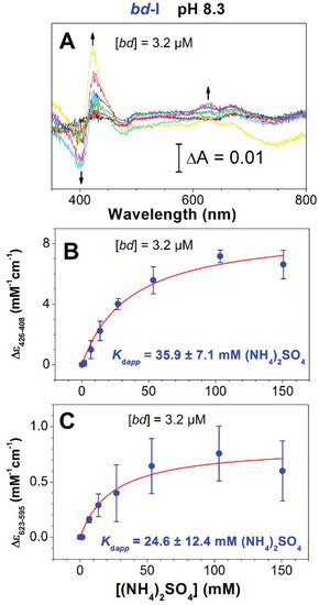 In the Soret region, the ammonia-induced spectrum showed a red shift with a maximum at about 423–428 nm and a minimum around 395–408 nm. In the near-IR region, there were two maxima at ~623 and ~673 nm, and a broad minimum at ~740 nm. The changes may report the interaction of ammonia with the ferric heme d. The magnitude of the changes increased with increasing concentrations of (NH4)2SO4. Analysis of the absorption titration curves measured at 426–408 and 623–595 nm (Figure 4B,C) yields Kdapp of 35.9 ± 7.1 and 24.6 ± 12.4 mM (NH4)2SO4, respectively. The titration profile (Figure 4B,C) is similar to that for the plot of percent enzyme activity versus (NH4)2SO4 (Figure 3C).