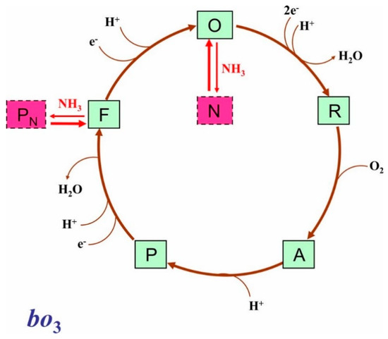 The possible effect of ammonia on the catalytic cycle of cytochrome bo3. Proposed catalytic intermediates O (o33+–OH CuB2+), R (o32+ CuB+), A (o32+–O2 CuB+), P (o34+=O2− CuB2+–OH), and F (o34+=O2− CuB2+) are shown. Possible redox and ligation state of the binuclear site in each intermediate is indicated in brackets. Only chemical protons are shown. Pumped protons are not shown for clarity. The two ferryl species P and F likely differ in the presence of an aromatic amino acid radical in P, as in the intermediate PM of cytochrome c oxidase [66]. NH3 presumably converts F into the PN state (o34+=O2− CuB2+–NH3) and O into the ammonia complex N (o33+–NH2− CuB2+ and/or o33+– NH2− CuB2+–NH3), thereby leading to the inhibition of the oxidase activity.