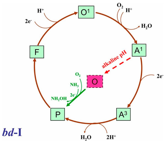 A1 is a catalytic intermediate of cytochrome bd-I [73], whereas O does not participate in the catalytic cycle [72]. The conversion of A1 into O under alkaline conditions seems to correlate with the observation that the O2-reductase activity of cytochrome bd-I at pH 8.3 is lower than that at pH 7.0 (Vmax of 30 ± 6 mol O2/mol enzyme/s at pH 8.3 versus 152 ± 15 mol O2/mol enzyme/s at pH 7.0). We hypothesize that the addition of ammonia to the oxidized cytochrome bd-I at pH 8.3 promotes the formation of P from O (Figure 6), thereby increasing the enzyme activity. NH3 may be oxidized to NH2OH serving as a two-electron donor in this reaction. NH3 could also react with the one electron-reduced enzyme (O1) with the production of F and NH2OH.