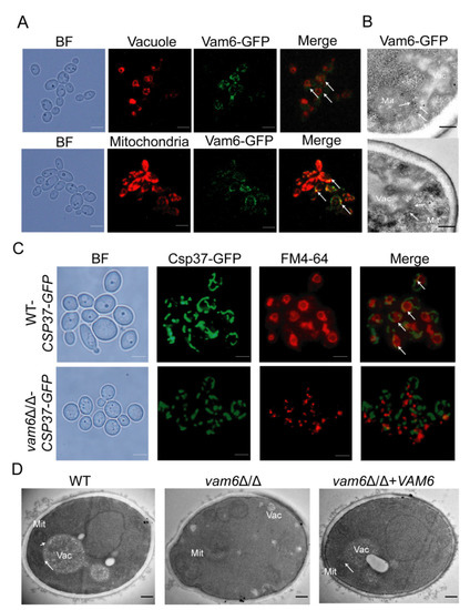 To study the role of Vam6 in the formation of vCLAMPs, mitochondria were labeled by Csp37-GFP, a fusion protein localized on the outer membrane of mitochondria in C. albicans (Figure S2), could be used as a mitochondria marker [22], and vacuoles were labeled by FM4-64 in wild-type (WT) and vam6Δ/Δ strains. Fluorescence microscopy showed that the WT strain had abundant mitochondrion-vacuole colocalizing sites (indicated by white arrows, Figure 1C, up), indicating normal formation of vCLAMPs in the WT cells. In contrast, vam6Δ/Δ showed no obvious mitochondrion-vacuole colocalizing sites (Figure 1C, bottom), suggesting a severe defect in formation of vCLAMPs in the mutant. Transmission electron microscopy (TEM) observation further confirmed that the WT and reconstituted strains had regular mitochondria adhering to the vacuoles, while the mutant showed fragmented mitochondria not contacting the vacuoles (Figure 1D). These results revealed that Vam6, as a vCLAMP-localizing protein, is required for normal formation of vCLAMPs in C. albicans.