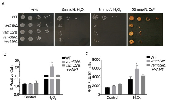 Hypersensitivity of the vam6Δ/Δ mutant to oxidative stress. (A) Cells were overnight cultured in liquid YPD, spotted on YPD plates containing 5 mM H2O2, 7 mM H2O2, or 50 mmol Cu2+. The plates were then cultured and photographed. (B) Percent of dead cells under treatment of 5 mM H2O2 for 1 h. The treated cells were stained by PI and observed by fluorescence microscopy for calculation of PI-positive cells. (C) Intracellular ROS levels of the strains revealed by DCFH-DA staining. * indicates significant difference between the mutant and the control strains (p < 0.05).