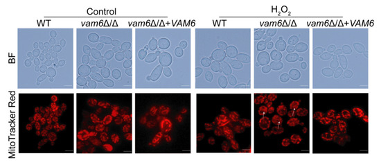 To investigate the role of Vam6 in mitochondrial functions, the mitochondria were visualized by MitoTracker Red staining [26]. Generally, the mitochondria had a tubular structure, exhibiting a bifurcated, cross-linked network in WT under oxidative stress. Moreover, the vam6Δ/Δ+VAM6 significantly restore normal mitochondrial network (Figure 4). In contrast, the mitochondria in vam6∆/∆ were significantly fragmented under oxidative stress (Figure 4). Therefore, these results revealed that Vam6 plays an important role in maintaining normal mitochondrial morphology under oxidative stress.