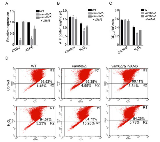 In S. cerevisiae, mitochondrial DNA (mtDNA, e.g., COX2, ATP6) stability affects cell growth. In this study, the role of Vam6 in maintaining mtDNA stability was explored by real-time quantitative PCR (qRT-PCR). The result showed that the copy numbers of tested mtDNA genes were significantly reduced in vam6Δ/Δ as compared to control strains under H2O2 conditions (Figure 5A) confirming that Vam6 was involved in maintaining mtDNA stability under oxidative stress.