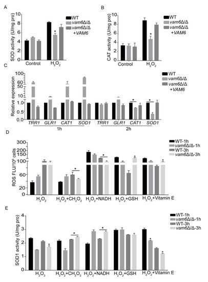 Some reports indicated that superoxide dismutases (SODs) play an essential role in protecting cells under oxidative conditions, and it is indispensable to elimination the superoxide anion radical (O2•−) in the cells [31]. The SOD1 (Cu2+/Zn2+), SOD2 (Mn-SOD), SOD3 (Fe-SOD) were intracellular enzymes, while SOD4, SOD5, and SOD6 were GPI-anchored superoxide dismutase that distribute on the cell wall surface [32]. Studies have shown that SOD1 and SOD2 can remove superoxide radical (O2•−) in eukaryotic cells [32]. In order to further study the mechanism of the SOD activity decrease in the mutant, the SOD1 (Copper/zinc superoxide dismutase) enzyme activity and ROS accumulation levels were examined. It can be seen that the addition of antioxidants, i.e., formic acid (CH2O2) and NADH, could effectively recover SOD1 enzyme activity and reduce ROS accumulation level in vam6∆/∆ under oxidative stress (Figure 6D,E). However, there was no significant change of SOD2 activity (results not shown). Our findings suggest that deletion of VAM6 reduces the antioxidant capacity of vam6∆/∆ by reducing the SOD1 enzyme activity.