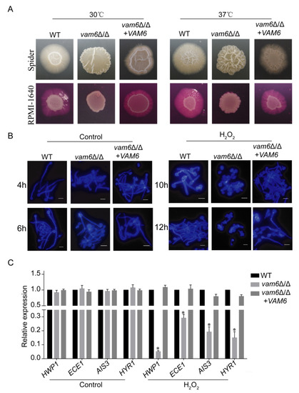 Studies have found that morphogenesis (e.g., hyphal development) is very important for the virulence of C. albicans [33]. There were many factors that affect the morphogenic ability of C. albicans. However, the effect of vCLAMPs on morphogenesis has not been reported in C. albicans. After culturing at 30 °C and 37 °C, unlike the control strains forming wrinkled colonies with obvious hyphal extension, the vam6Δ/Δ mutant formed smooth colonies without wrinkles and hyphae around the colony (Figure 7A). Moreover, the WT, vam6Δ/Δ, and reconstituted strains could all form hyphal cells in RPMI-1640 medium (Figure 7B). However, under the oxidative stress condition, while the WT and reconstituted strains could form hyphae after 10~12 h, the mutant failed to do so. These results confirmed that Vam6 plays an important role in hyphal development in C. albicans under oxidative stress conditions.