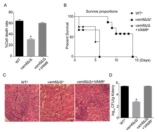 Effect of VAM6 deletion on virulence of C. albicans. (A) Macrophage-killing capacity of the strains WTa, vam6Δ/Δa, vam6Δ/Δ+VAM6a. (B) Survival rate of the mice infected by the strains. (C) Histopathological images of the kidneys infected by the strains. Bar = 50 μm. (D) Fungal burden in the kidney suffering from infection by the strains after five days. * indicates significant difference between the control strains and the mutant (p < 0.05). Values represent mean ± SD.