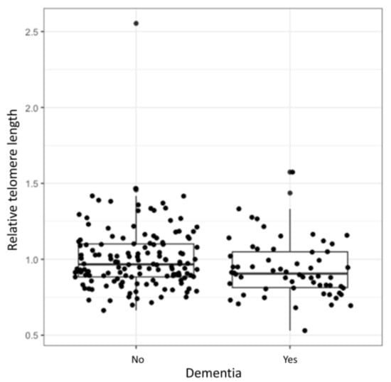 Relative TL in relation to dementia. Median relative TL of a cohort with and without dementia (range between the 1st and 3rd quartile).