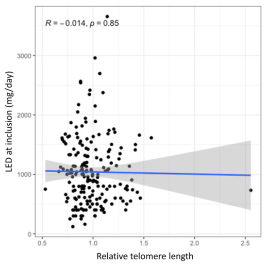 No statistically significant association was observed between the relative TL and current dose of dopaminergic therapy neither in the univariate analysis (B = −36.39, 95% CI = −407.7–334.9, p = 0.847) nor in the multivariate analysis after adjustment for age at enrolment and disease duration (B = 18.34, 95% CI = −309.11–345.79, p = 0.912). Furthermore, this association was also not statistically significant after adjustments for genetic variability in antioxidant and neuroinflammatory pathways (B = 14.48, 95% CI = −317.69–346.65, p = 0.932; B = 43.58, 95% CI = −285.74–372.89, p = 0.794, respectively). The lack of correlation between the relative TL and the current LED is graphically presented in the Figure 2, whereas complete results of this analysis are presented in the Supplementary Table S2.