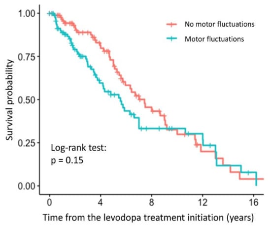 Survival curve for PD patients with and without motor fluctuations after levodopa treatment initiation.