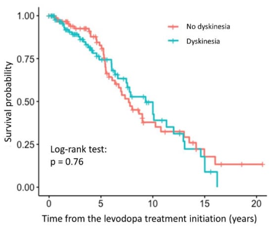 Survival curve for PD patients with and without dyskinesia after levodopa treatment initiation.