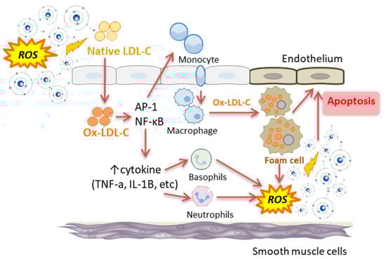 The interplay between oxidative stress and inflammatory processes (i.e., NFκB and cytokine activity) in the development of endothelial cell damage and apoptosis. ROS: reactive oxygen species; Ox-LDL-C: oxidised low density lipoprotein cholesterol; AP-1: activator protein-1; NF-κB: nuclear factor-kappa B; TNF-α: tumour necrosis factor- α; IL-1β: interleukin-1β.