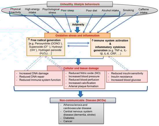 As discussed above, a persuasive case is emerging for a pivotal role of oxidative damage and inflammation in the remodelling of tissue into its diseased phenotype at the biochemical and cellular levels [,,,]. Therefore, the assessment of oxidative and inflammatory biomarkers may improve disease stratification []. As previously mentioned, robust associations between the development of NCDs and unhealthy lifestyle behaviours have been known for some time [,,]. Therefore, it is plausible that these two causal factors are interlinked. Indeed, there is a growing body of evidence showing that various lifestyle behaviours can induce a state of oxidative stress and inflammation which eventually leads to chronic NCDs [,,] (Figure 2). In the following section, we provide evidence on how specific modifiable lifestyle behaviours have been linked to oxidative stress and inflammatory activity.