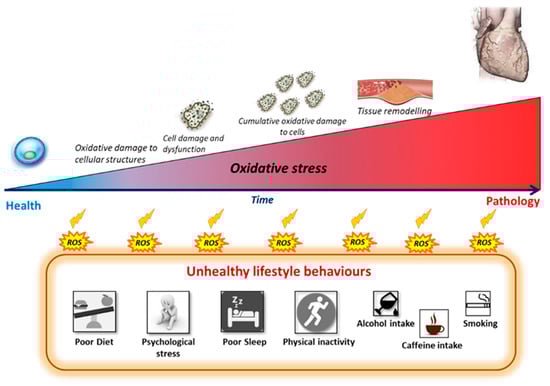Progressive oxidative damage processes induced by chronic exposure to unhealthy lifestyle behaviours. Adherence to unhealthy lifestyle behaviours can gradually shift the body’s redox balance toward a state of oxidative stress with chronic subclinical damage to cells, tissues and organs. Oxidative damage plays a major role in the onset and development of non-communicable disease such as cardiovascular disease. ROS: Reactive oxygen species.