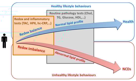 Assessment of redox state (i.e., assessment of the degree to which oxidative stress is present) as a possible approach for early distinction of whether various lifestyle behaviours are driving an individual toward health or toward development of disease-related pathologies. NCDs: non-communicable diseases; TAC: total antioxidant capacity; HPX: lipid hydroperoxides; hc-CRP: high sensitivity C-reactive protein; Chol: cholesterol; TG: triglycerides; HDL: high density lipoprotein.
