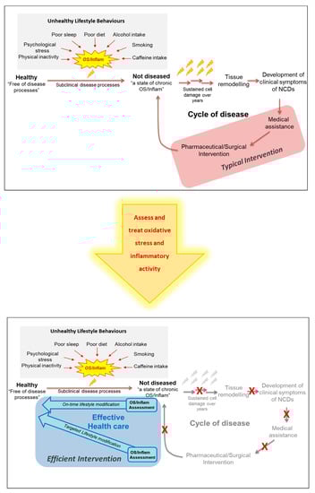 It is relevant to reiterate that a condition of oxidative stress and inflammation is not a diseased state but is rather a preclinical state representing significant cellular stress and damage [,,,]. The information and perspective presented in this paper supports the view that this state can be produced as a result of chronic exposure to various unhealthy lifestyle behaviours. The damage caused by oxidative stress and inflammation, if not detected early and prevented, can accumulate over time causing serious tissue remodelling that will eventually result in a diseased phenotype [,,]. Therefore, the assessment of redox state during the early stage when no clinical symptoms of disease are manifest can assist with identifying an individual’s early biochemical shifts toward development of disease. In this way, the ongoing tissue damage due to chronic oxidative stress and inflammation can be reduced or even halted by early modification strategies such as lifestyle changes. This will prevent or limit development of irreversible organ damage and subsequent disease. Improving the course of preclinical disease in this way not only can provide improved patient outcomes but also can reverse disease progression and, therefore, reduce both the need and costs of ongoing healthcare.