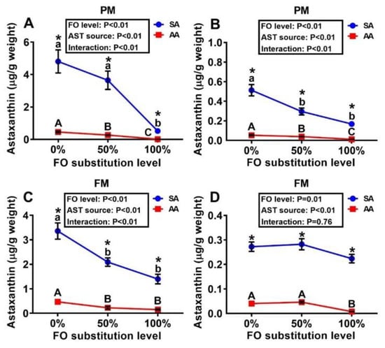 Effects of dietary fish oil (FO) substitution by docosahexaenoic acid (DHA)-rich microalgae and source of astaxanthin (AST) on astaxanthin concentrations in the muscle (fillet, A,C) and liver (B,D) of juvenile rainbow trout fed the plant meal- (PM, A,B) and fishmeal (FM, C,D)-based diets. Means labelled with different letters [lowercase (a, b), synthetic astaxanthin (SA) groups; uppercase (A–C), microalgae astaxanthin (AA) groups] are different between various fish oil substitutions (p < 0.05). Asterisks (*) indicate differences between SA and AA groups (p < 0.05) at the same level of FO substitution. FO: fish oil. AST: astaxanthin.