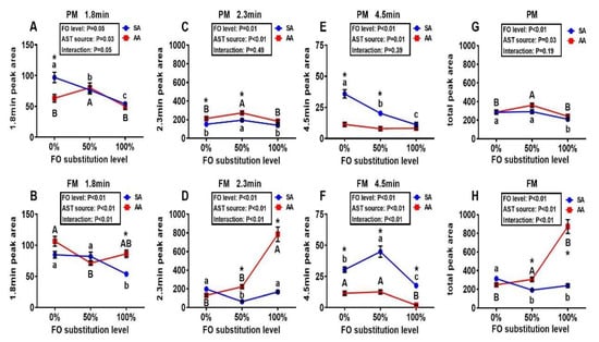 Effects of dietary fish oil substitution by DHA-rich microalgae and source of astaxanthin on relative areas of hepatic astaxanthin metabolite peaks (A,B: 1.8 min; C,D: 2.3 min; E,F: 4.5 min; G,H: total of the three peaks) in juvenile rainbow trout fed the plant meal- (PM, A,C,E,G) and fishmeal (FM, B,D,F,H)-based diets. Means labelled withdifferent letters [lowercase (a, b), synthetic astaxanthin (SA) groups; uppercase (A, B), microalgae astaxanthin (AA) groups] are different between various levels of fish oil substitution (p < 0.05). Asterisks (*) indicate differences between SA and AA groups (p < 0.05) at the same level of FO substitution. The absence of different letters (a, b, c or A, B) or asterisks (*) between means indicates no significant differences. FO: fish oil. AST: astaxanthin.