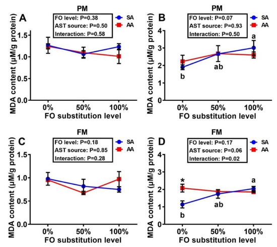 Effects of dietary fish oil substitution by DHA-rich microalgae and source of astaxanthin on MDA concentrations in the muscle (fillet, A,C) and liver (B,D) of juvenile rainbow trout fed the plant meal- (PM, A,B) and fishmeal (FM, C,D)-based diets. Means labelled with different letters [lowercase (a, b), synthetic astaxanthin (SA) groups] are different between various fish oil substitutions (p < 0.05). Asterisks (*) indicate differences between the SA and AA groups (p < 0.05) at the same level of FO substitution. The absence of different letters (a, b) or asterisks (*) between means indicates no significant differences. MDA: malondialdehyde. FO: fish oil. AST: astaxanthin.