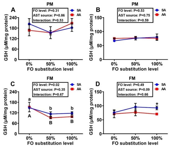 Effects of dietary fish oil substitution by DHA-rich microalgae and source of astaxanthin on GSH concentrations in the muscle (fillet, A,C) and liver (B,D) of juvenile rainbow trout fed the plant meal- (PM, A,B) and fishmeal (FM, C,D)-based diets. Means labelled with different letters [lowercase (a, b), synthetic astaxanthin (SA) groups; uppercase (A, B), microalgae astaxanthin (AA) groups] are different between various fish oil substitutions (p < 0.05). Asterisks (*) indicate differences between the SA and AA groups (p < 0.05) at the same level of FO substitution. The absence of different letters (a, b or A, B) or asterisks (*) between means indicates no significant differences. GSH: glutathione. FO: fish oil. AST: astaxanthin.