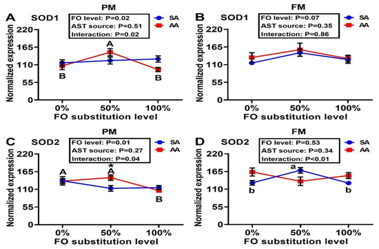 Effects of dietary fish oil substitution by DHA-rich microalgae and source of astaxanthin on hepatic mRNA levels of SOD1 (A,B) and SOD2 (C,D) of juvenile rainbow trout fed the plant meal- (PM, A,C) and fishmeal (FM, B,D)-based diets. Means labelled with different letters [lowercase (a, b), synthetic astaxanthin (SA) groups; uppercase (A, B), microalgae astaxanthin (AA) groups] are different between various fish oil substitutions (p < 0.05). Asterisks (*) indicate differences between SA and AA groups (p < 0.05) at the same level of FO substitution. The absence of different letters (a, b or A, B) or asterisks (*) between means indicates no significant differences. SOD: superoxide dismutase. FO: fish oil. AST: astaxanthin.